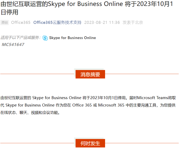 由世纪互联运营的国内版微软 Skype for Business Online 服务,则是比官方晚了两年多才停用。